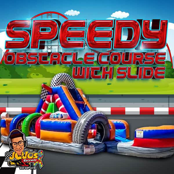 Our Race Car Obstacle Course is a perfect match for your racetrack! Kids can play on the slide while they wait their turn for the racetrack. It is only available as an ADD-ON, and cannot be booked separately. It can be used wet or dry. It has a 15ft slide, tunnels, climbing wall and obstacle pop-ups. It also has a splash pad for those hot days. Book this awesome inflatable today for hours of fun! Dimensions- height- 16ft, length 30ft, width, 13ft ($200/dry) ($245/wet) for the duration of your racetrack rental. (Recommended for ages 3-13)