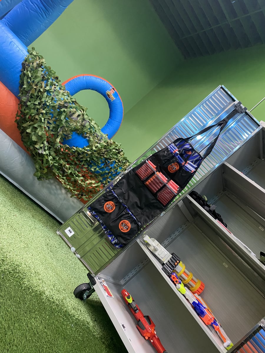 6 Ride-ons (self-pedal go-karts & scooters), 6 safety goggles, 10 dart guns w/ ammo, 4 walkie-talkies, 6 neck gaiters (masks), & 6 tactical vests