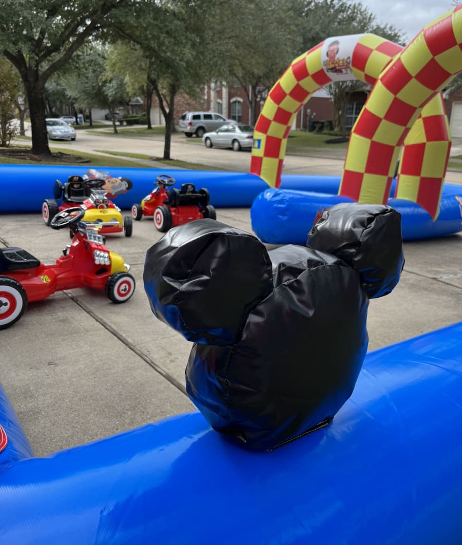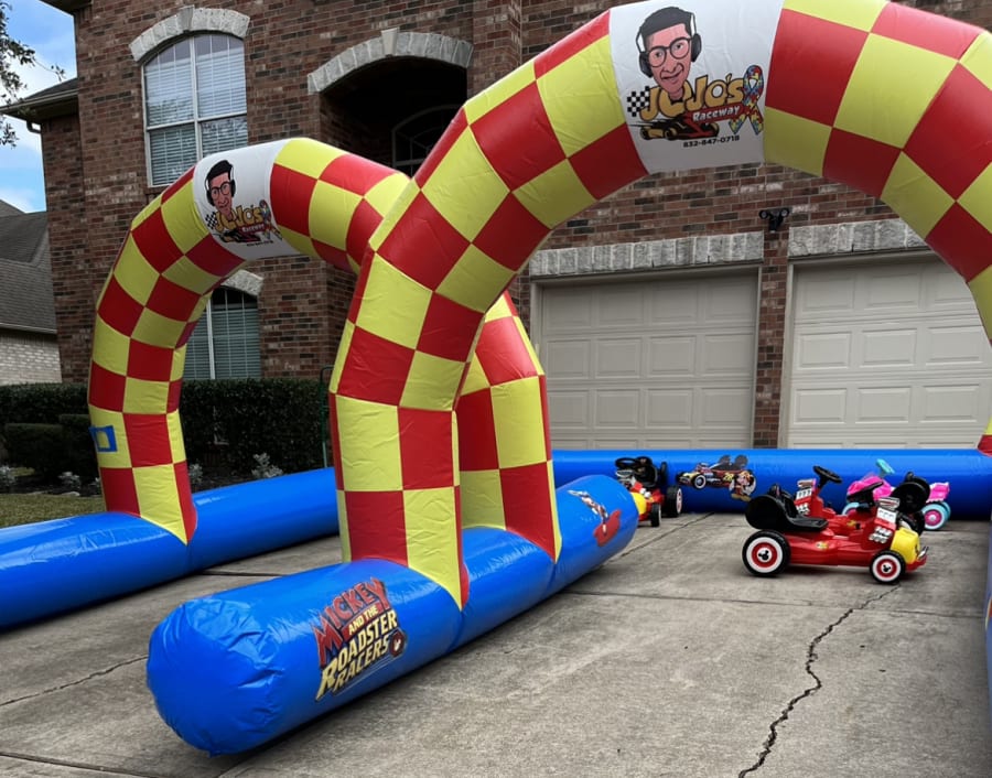 Can only work on a hard surface such as cement, asphalt, tile or wood. The racetrack measures 18ft x 30ft, and can fit in a standard size double driveway! We can set up in a clubhouse/community center, cul-de-sac, venue parking lot, or school/childcare center. Must be on an even leveled space. max number of cars is 4. Set up and removal takes between 30-45 minutes - this is not included in your booked time.